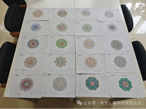 进入到曼陀罗绘画环节,同学们挑选了各自喜欢的模板进行涂色,分别从黑色彩铅涂抹快画、五行置换法、聚焦正念疗愈画法依次展开。韩臻、唐燕沿桌对同学们的作品进行指导,朱江月饶有兴致的参与到曼陀罗的绘制中,并与同学们交流自己的创作灵感。最后,大家分别给自己的作品命名,并互相分享了作品的深层含义,以及活动中的感受。分享的过程充满了真诚与感动,现场洋溢着香薰和爱的暖流
