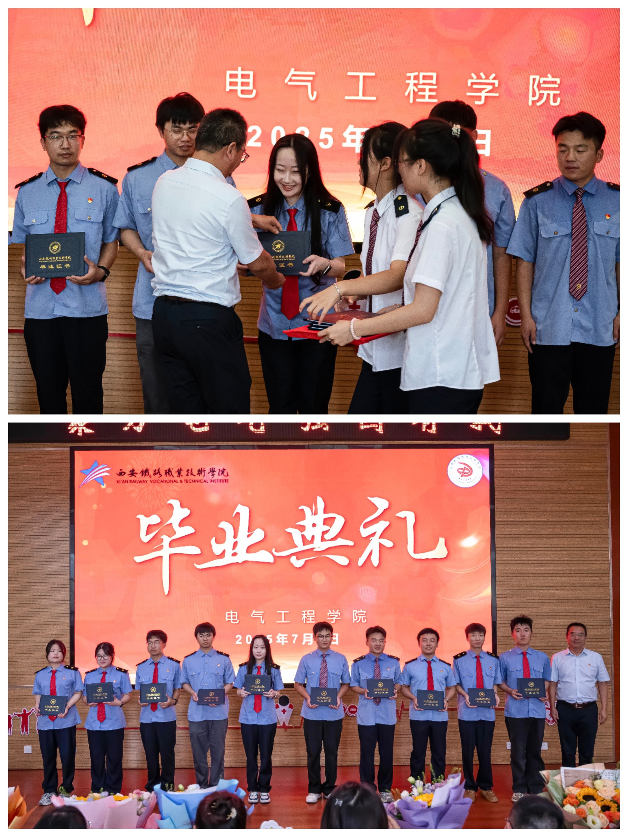 典礼最后,全体师生起立,齐声唱响电气工程学院院歌。礼毕,师生们合影留念,用镜头记录下这场青春的告别与新程的启航。