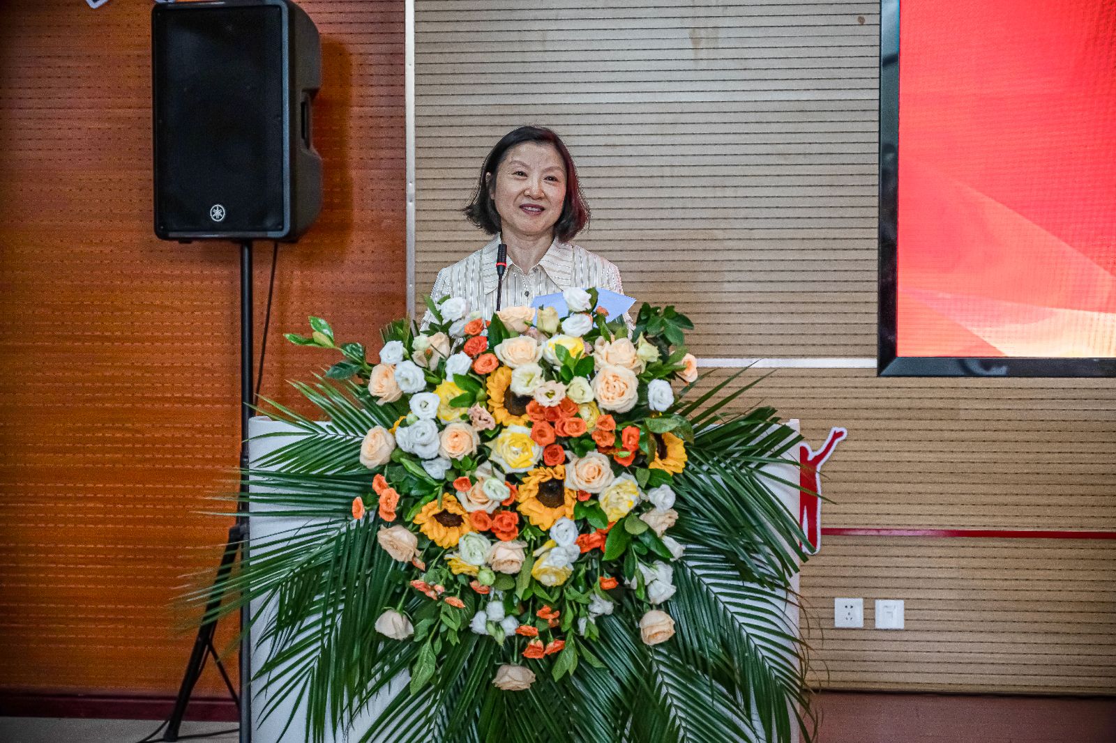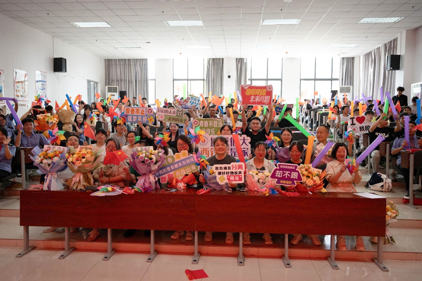 随后的献花环节温情涌动。毕业生代表手捧鲜花,走向台前为老师们献上敬意,深深鞠躬中,是学子对师长四年栽培的感恩;老师们微笑接过鲜花,眼中满是欣慰与期许,师生情谊在这一刻凝聚成最动人的画面。
