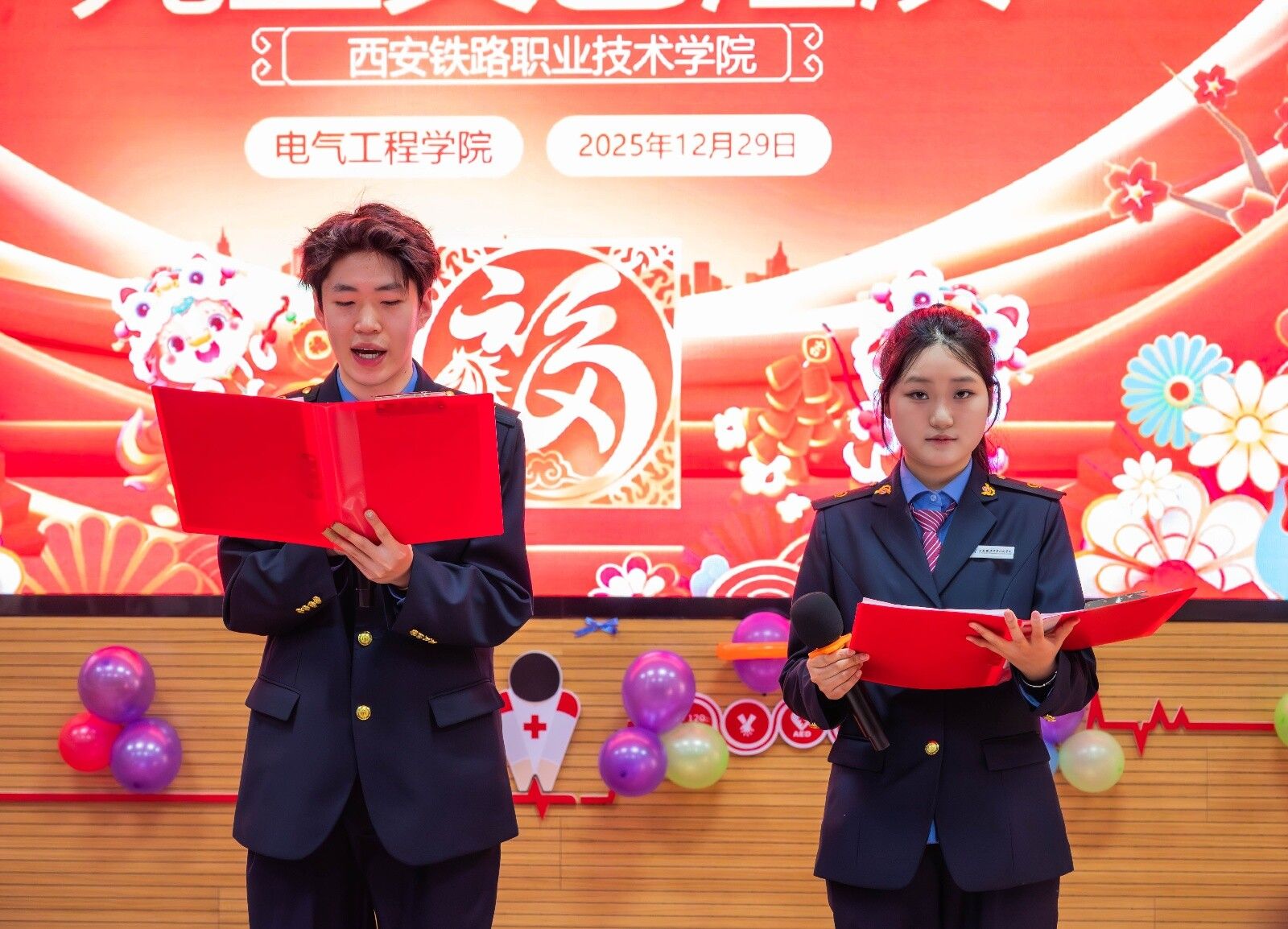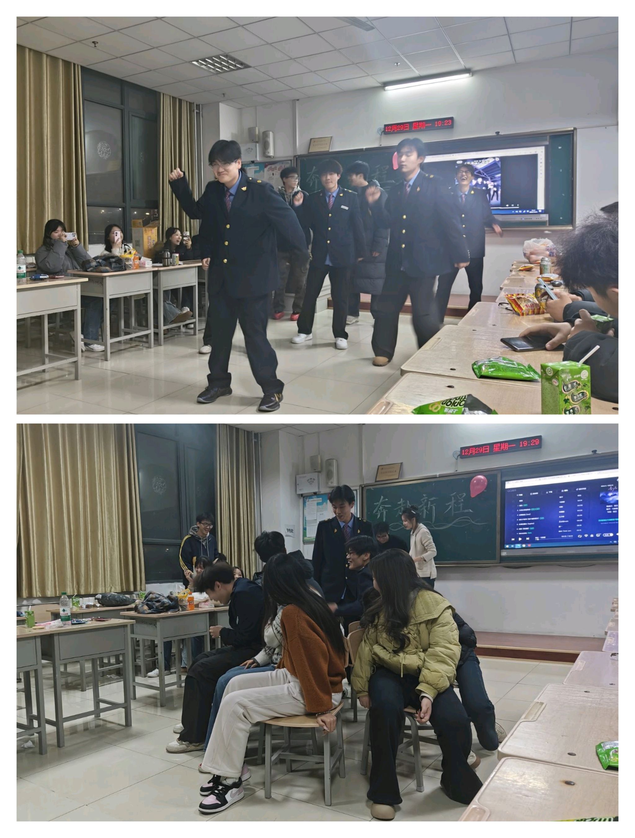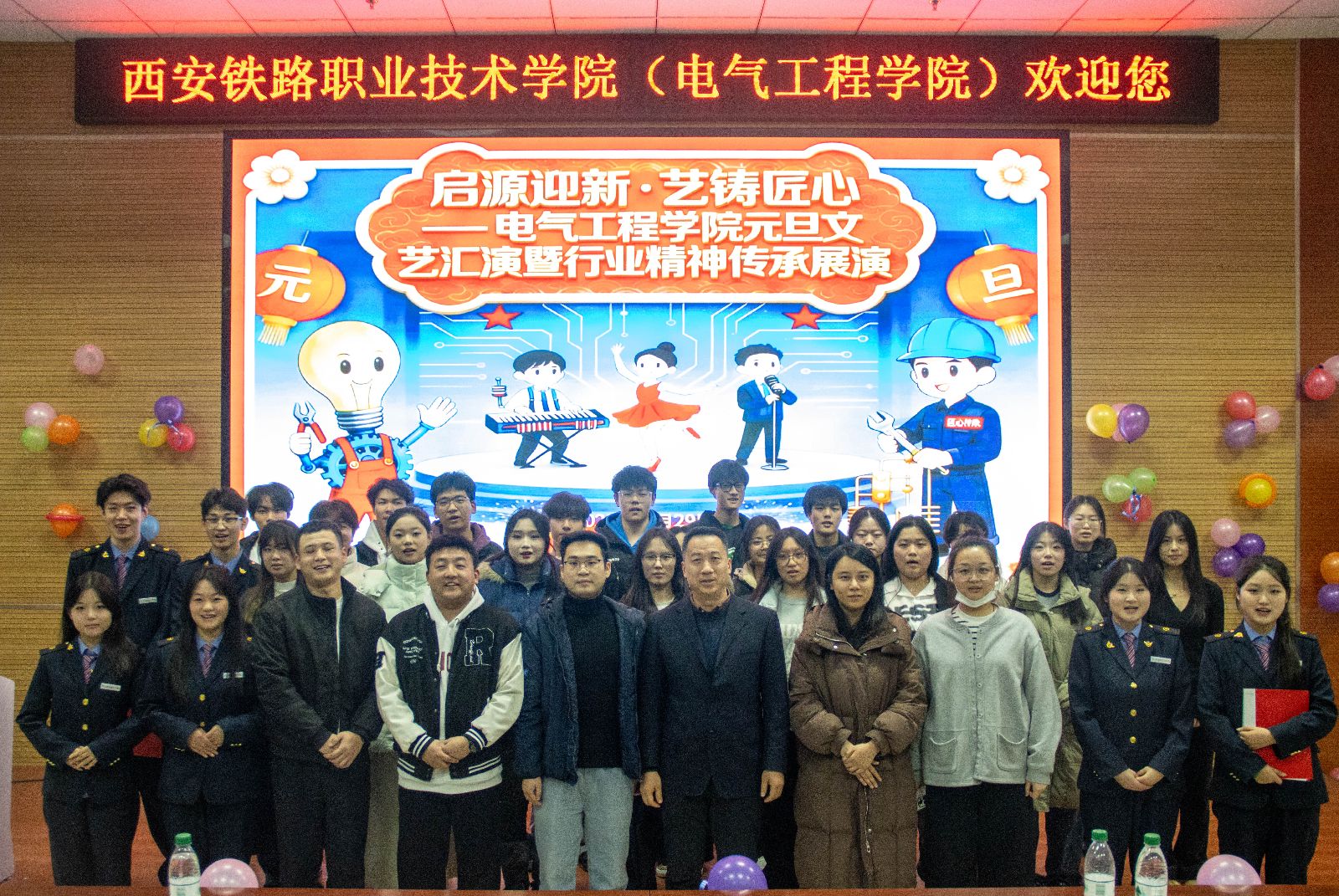 不光如此,我院各班级也开展形式多样的元旦联欢活动。教室里张灯结彩,暖意融融,同学们自编自导小品、歌曲串烧、乐器独奏等节目,在欢声笑语中互送新年祝福;部分班级还组织了“行业精神分享会”,同学们结合专业学习分享铁路电气领域榜样故事,在班级小舞台上传递匠心火种,为全院汇演的举办营造了热烈浓厚的迎新氛围。