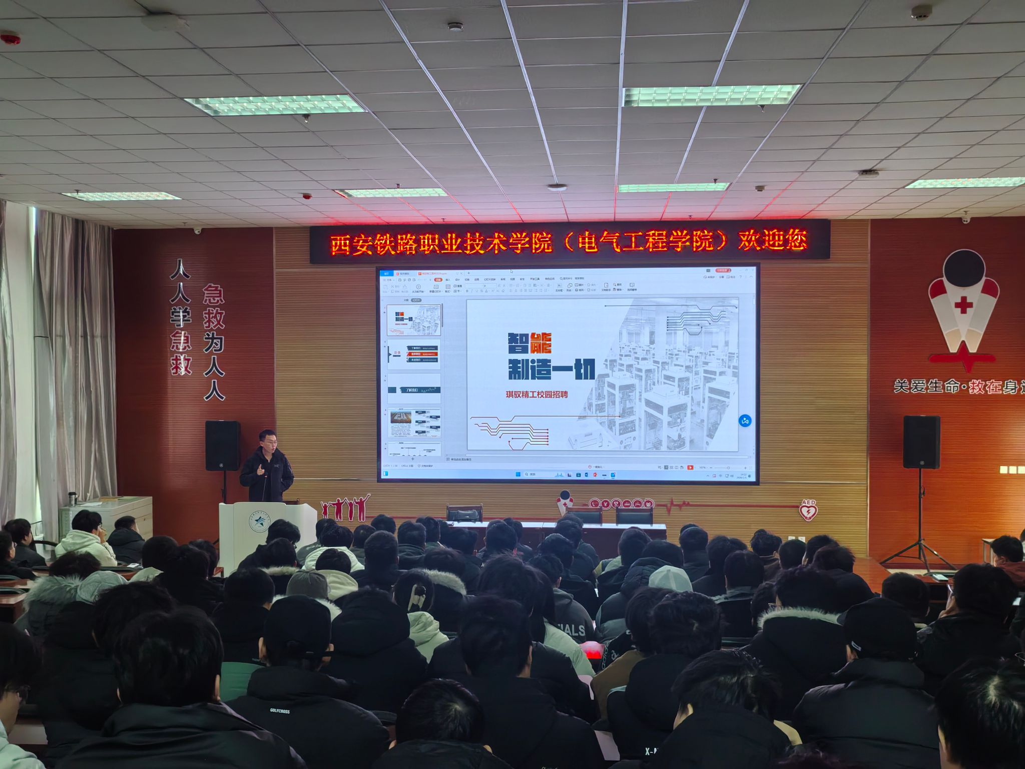 座谈会后,企业在电气楼阶梯大教室举办专场招聘宣讲会,吸引学院两百余名大三毕业生踊跃参会。宣讲现场,企业人事团队细致解答了岗位职责、薪资福利、晋升路径等学生关切问题,同学们积极互动交流,展现出强烈的求职意愿,现场纷纷扫码加入企业招聘联络群,等候线上面试通知,宣讲活动取得良好成效。