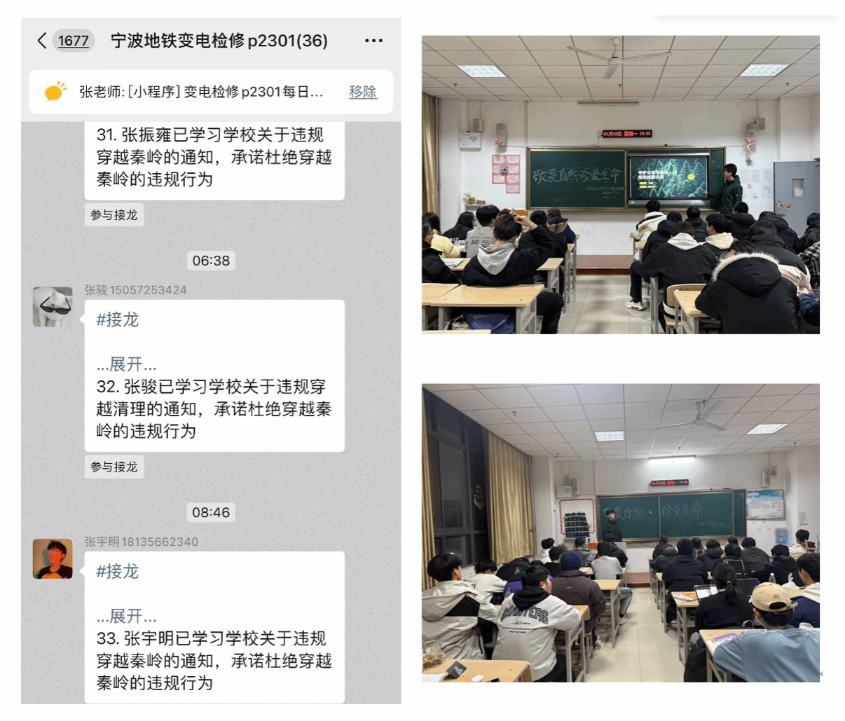 本次班会以“防范违规穿越秦岭、守护生命安全”为核心,通过案例警示、法规宣讲、风险摸排、技能普及等环节,引导学生树立安全守法理念。开场即结合2026年1月2日鳌山区域4名驴友违规登山致3人死亡的典型案例,直观揭示违规户外活动的致命风险;核心环节中,深入解读《秦岭生态环境保护条例》等法规,明确违规穿越的法律与经济责任,从生命安全、生态保护、个人前途三方面强化敬畏意识,并通过现场摸排、建立重点学生台账、签订《拒绝违规穿越秦岭承诺书》等举措,强化学生自我约束。同时,班会还详解合规户外活动边界、报备流程及应急自救技能,为学生提供科学指引。