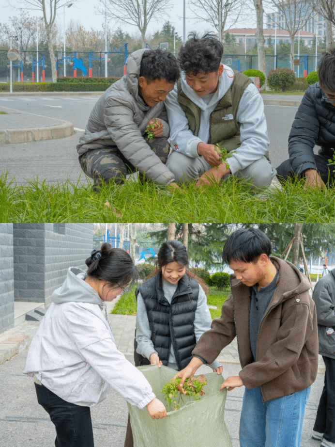 在校园的绿化带旁,师生们热情高涨、干劲十足。大家手持工具,分工协作,有的弯腰拔除杂草,有的仔细清理落叶,有的将杂物装入垃圾袋,配合默契、有条不紊。同学们俯身于草丛间,认真分辨杂草与绿植,不放过每一处细节,用实际行动守护着校园的绿色家园。